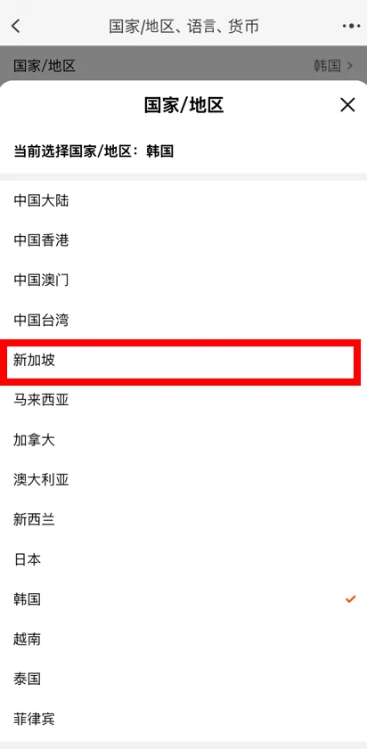 No matter what your current country setting is, you will need to change it to "Singapore." (For reference, in this example, the default setting was Korea.)